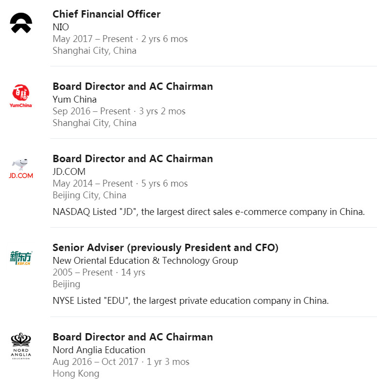加盟蔚来之前,谢东萤在金融领域的履历十分丰富,先后在摩根大通、瑞银资产、瑞银投资银行等公司工作多年,随后担任了新东方教育集团CFO,同时也是京东、英国教育集团诺德安达和百胜中国的董事,助力多家公司完成上市。