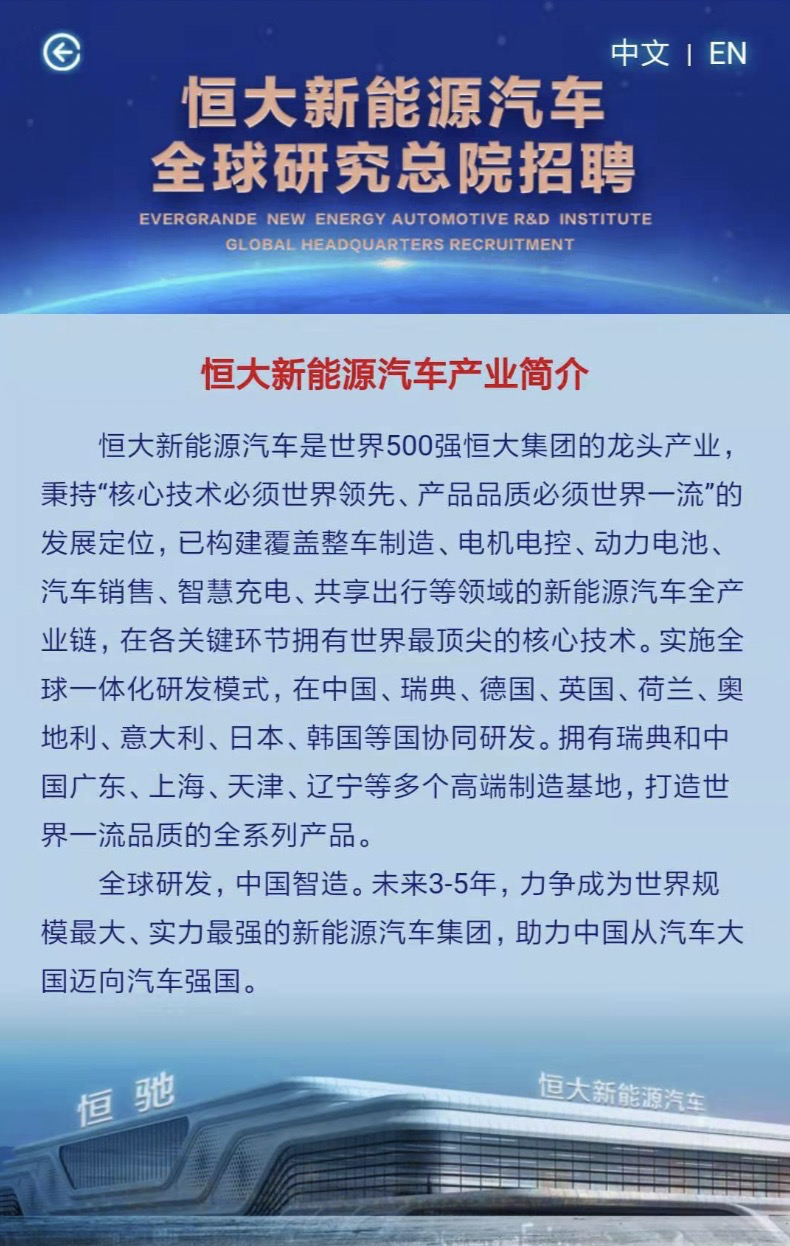 恒大新能源汽车全球研究总院在9月9日发布的招聘中称,未来3-5年,力争成为世界规模最大,实力最强的新能源汽车集团。按其官方介绍,其已构建覆盖整车制造、电机电控、动力电池、汽车销售、智慧充电、共享出行等领域的新能源汽车全产业链。(未来汽车日报)