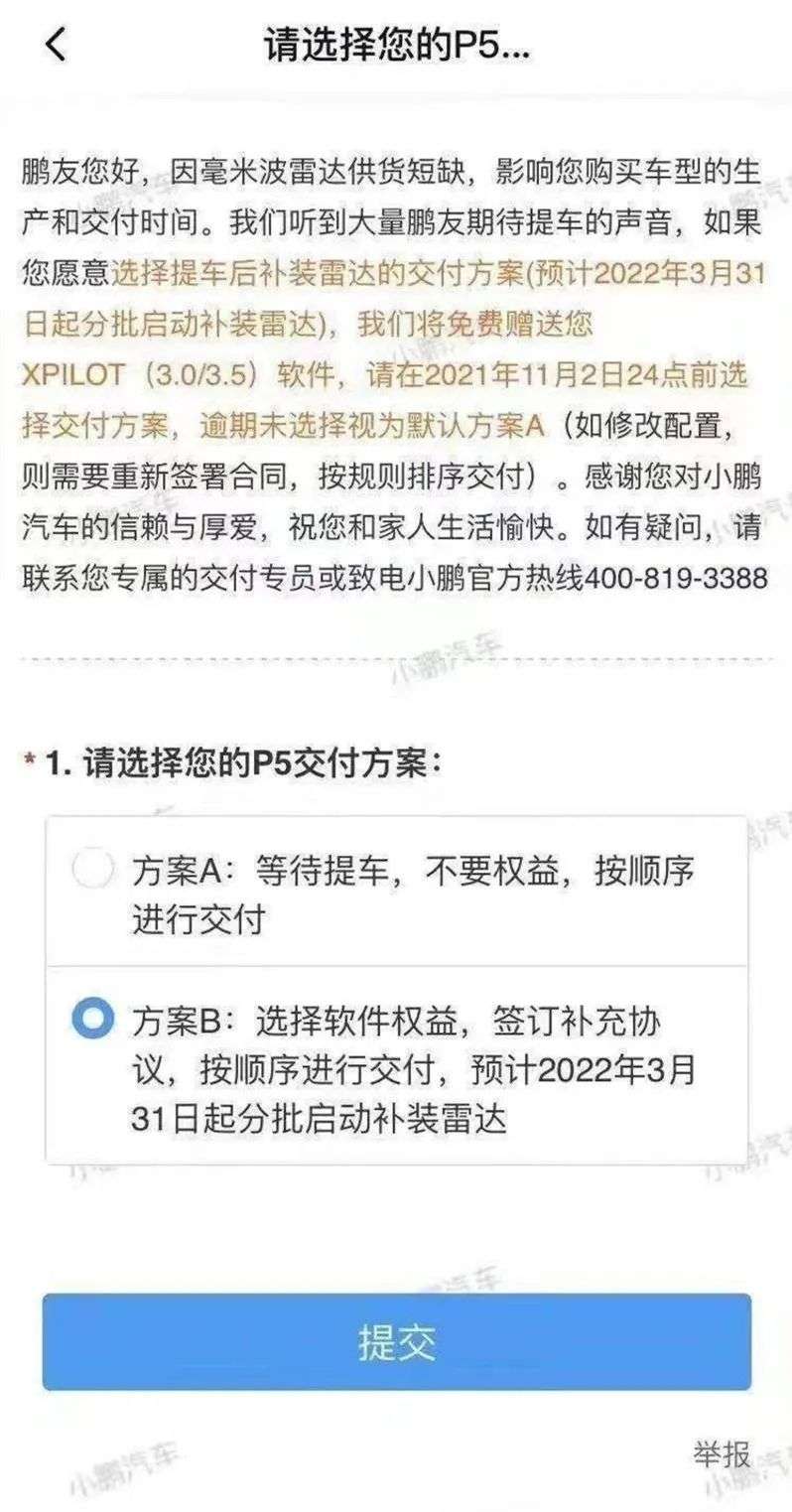 日前,小鹏汽车为刚开始交付的P5采取了先交付后补装雷达的方案,并计划在2022年3月底开始分批启动雷达补装。同时,为补偿车主这段时间的等待期,小鹏汽车将对这部分车主免费赠送XPILOT(3.0/3.5)软件。此信息一出,意味着在芯片短缺的压力下,小鹏汽车也加入了新车“减配交付”的队伍。