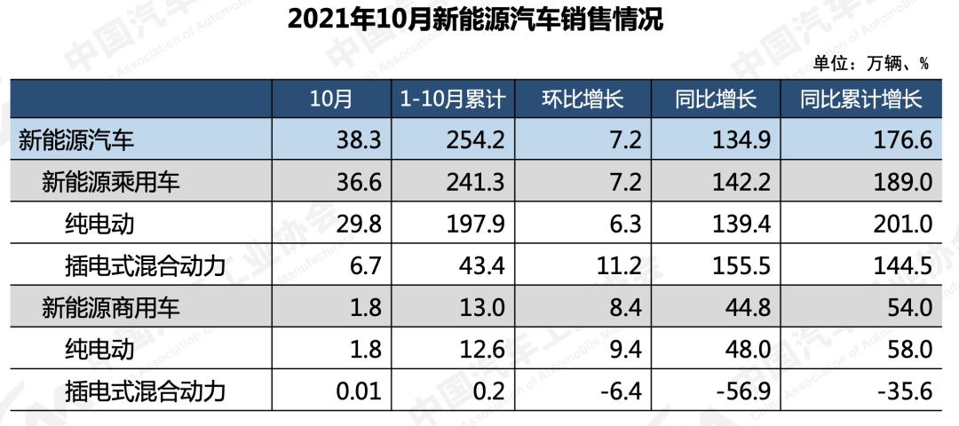 中汽协数据显示,10月份新能源汽车产销量再创新高,分别达到了39.7万辆和38.3万辆,环比增长12.5%和7.2%,同比增长均为1.3倍。1-10月,新能源汽车产销分别达到256.6万辆和254.2万辆,同比增长均达到1.8倍。