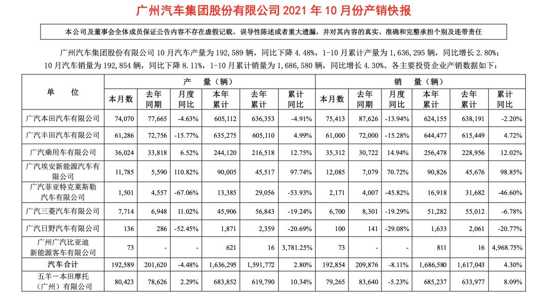这是合资车企在缺芯风暴下,销量大受冲击的主要原因,相反,部分自主品牌可以迅速反应,积极展开自救。这一点,在销量数据上已经有所体现。广汽乘用车10月销量同比增长14.9%至3.53万辆,环比增长54%,1-10月累计销量同比增长12%至25.65万辆。广汽埃安10月销量同比增长70.7%至1.21万辆,1-10月累计销量为9.08万辆,同比增长98.9%。