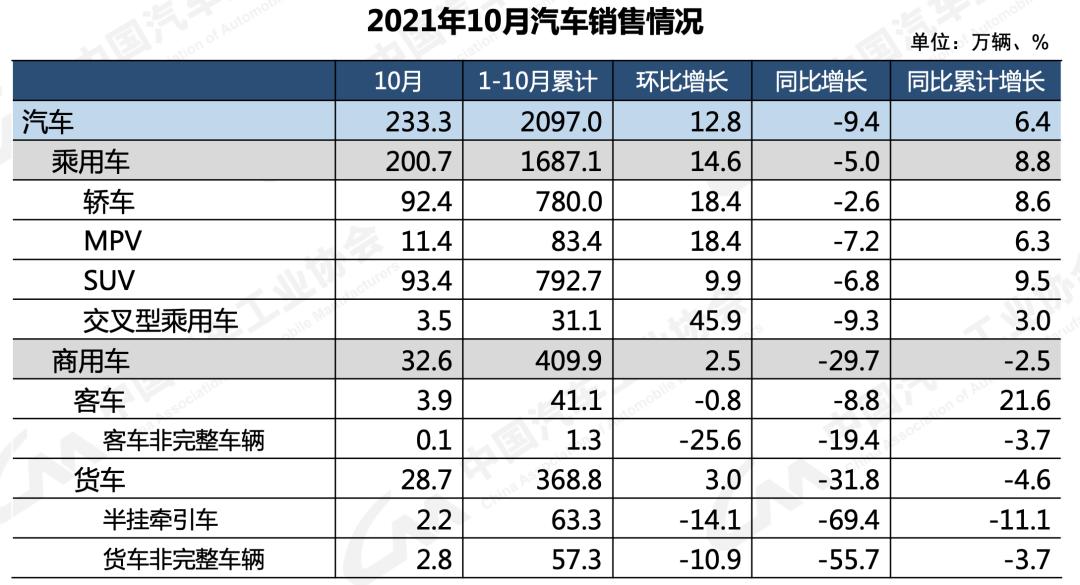 11月10日,中国汽车工业协会(以下简称“中汽协”)发布了最新一期汽车产销数据。10月份,汽车产销分别达到233万辆和233.3万辆,同比下降8.8%和9.4%。1-10月,汽车产销为2058.7万辆和2097万辆,同比增长5.4%和6.4%,增速比1-9月继续回落。