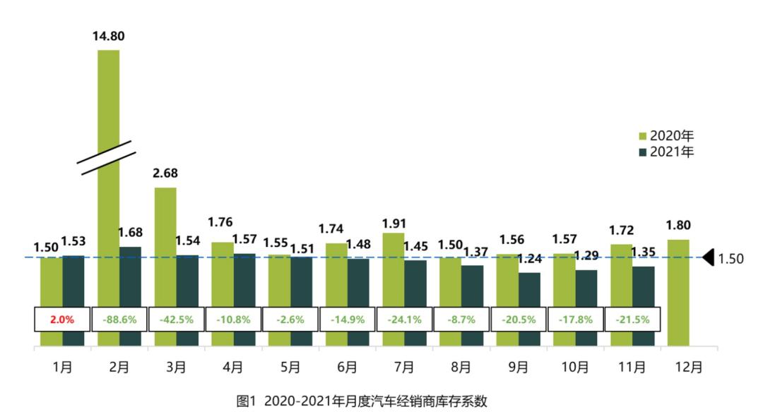 据中国汽车流通协会数据显示,今年11月,汽车经销商综合库存系数为1.35,同比下降21.5%,环比上升4.7%,库存水平回升,但库存系数仍在警戒线下方。