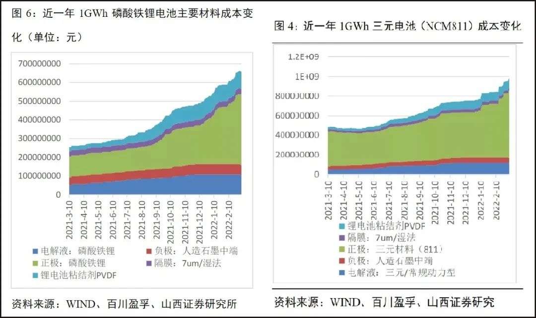 暂且放下镍不谈。按照过去一年的动力电池主要材料成本上涨情况,如果是一辆搭载70kWh NCM811电池包的电动车,仅电池包成本就从约3.5万元增加到约6.3万元;如果是一辆搭载50kWh磷酸铁锂电池包的廉价电动车,仅电池包成本就从约1.3万元增加到约3.3万元(粗估,只做数量级参考)。