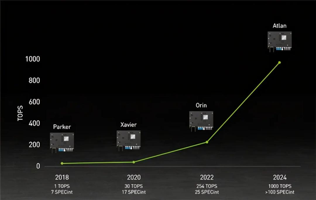 据了解,英伟达的自动驾驶芯片,从2018年的Parker到现如今的Orin,已经实现254倍的算力增长;最新的Atlan,算力更是达到了1000TOPS,“卷”得整个行业都毫无招架之力。