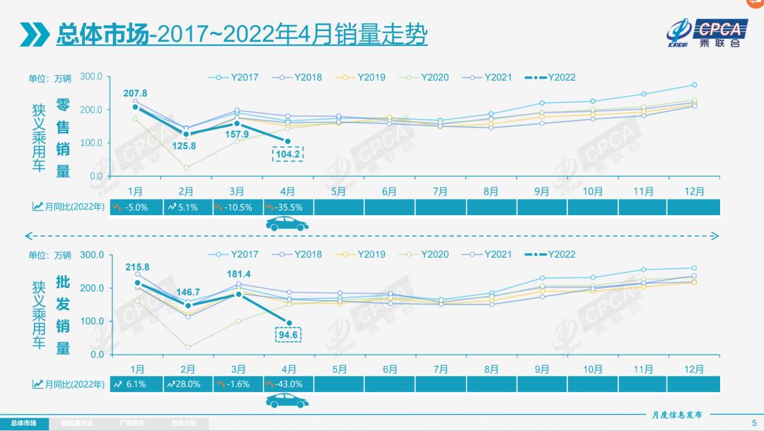 今年4月乘用车零售量同比下降35.5%、环比下降34.0%至104.2万辆。乘联会秘书长崔东树感叹:“如此之大的同比和环比下降幅度,是历年4月的最大值,自本世纪以来就没有出现过这么低的增长速度。”