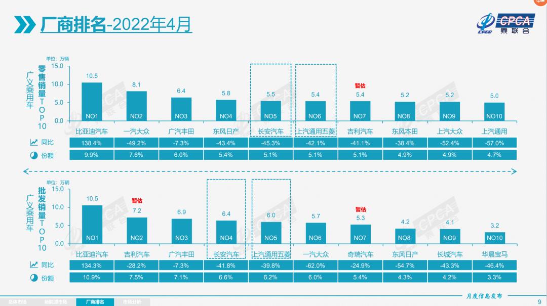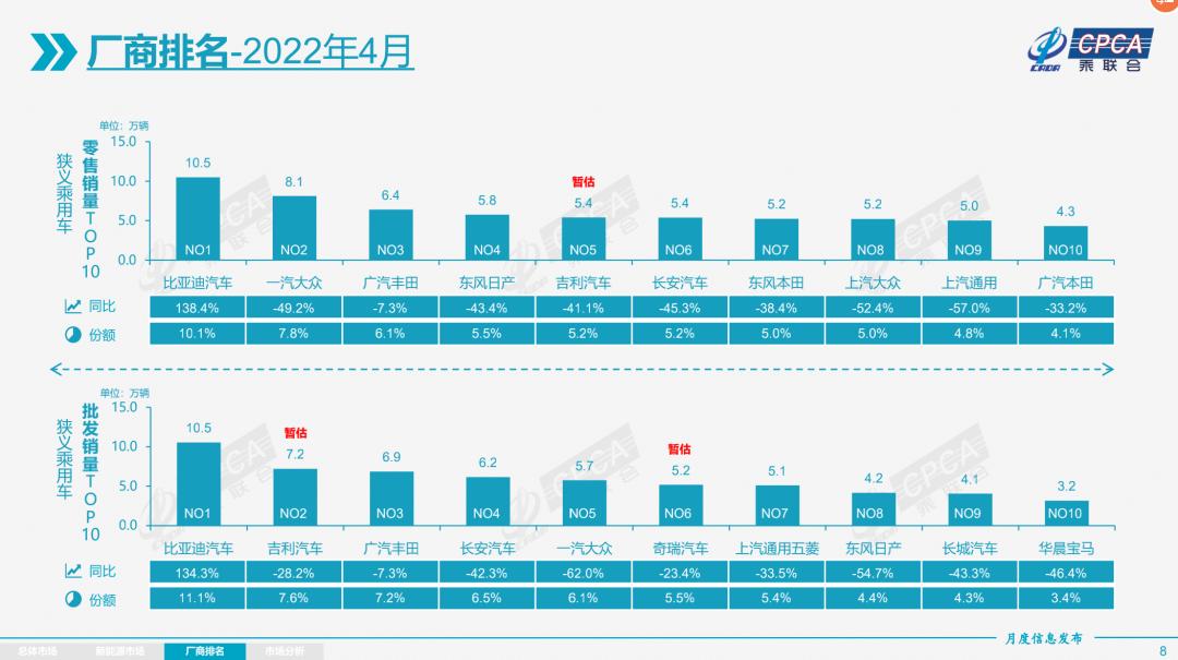 比亚迪不仅当选为4月零售量和批发量的双料冠军,而且还是前十厂商中唯一正增长的企业。4月,比亚迪零售销量和批发销量都为10.5万辆,同比的增长幅度都超过了130%,市场份额都超过了10%。在一众负增长的大厂面前,比亚迪颇有点鹤立鸡群的意味。