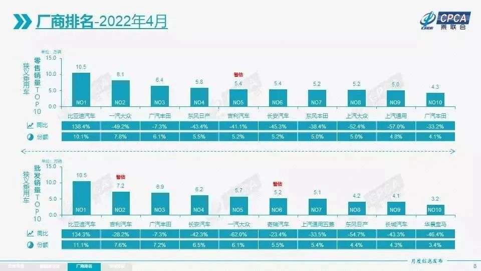 数据显示,2022年4月,乘用车市场零售销量104.2万辆,同比下降35.5%,环比下降34.0%,4月零售同比与环比增速均处于当月历史最低值。进入5月后,颓势虽然有所缓和,但并未扭转。5月上半月,全国乘用车市场零售48.4万辆,虽环比上月同期上涨27%,但同比去年下降21%。