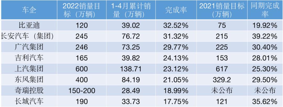 在疫情、俄乌冲突、贸易摩擦等不良因素的综合作用下,国内车市的上升走势被迫中断。正如前文所提到的,4月、5月上半旬车市销量骤然下跌。而从各企业自身情况来说,同样不容乐观。据统计,截至4月底,销量目标完成率能超过30%的企业,仅有比亚迪、长安汽车(集团)两家,哪怕比亚迪前4个月累计新能源车销量同比暴涨387.94%,可销量目标完成率仍不足三分之一。