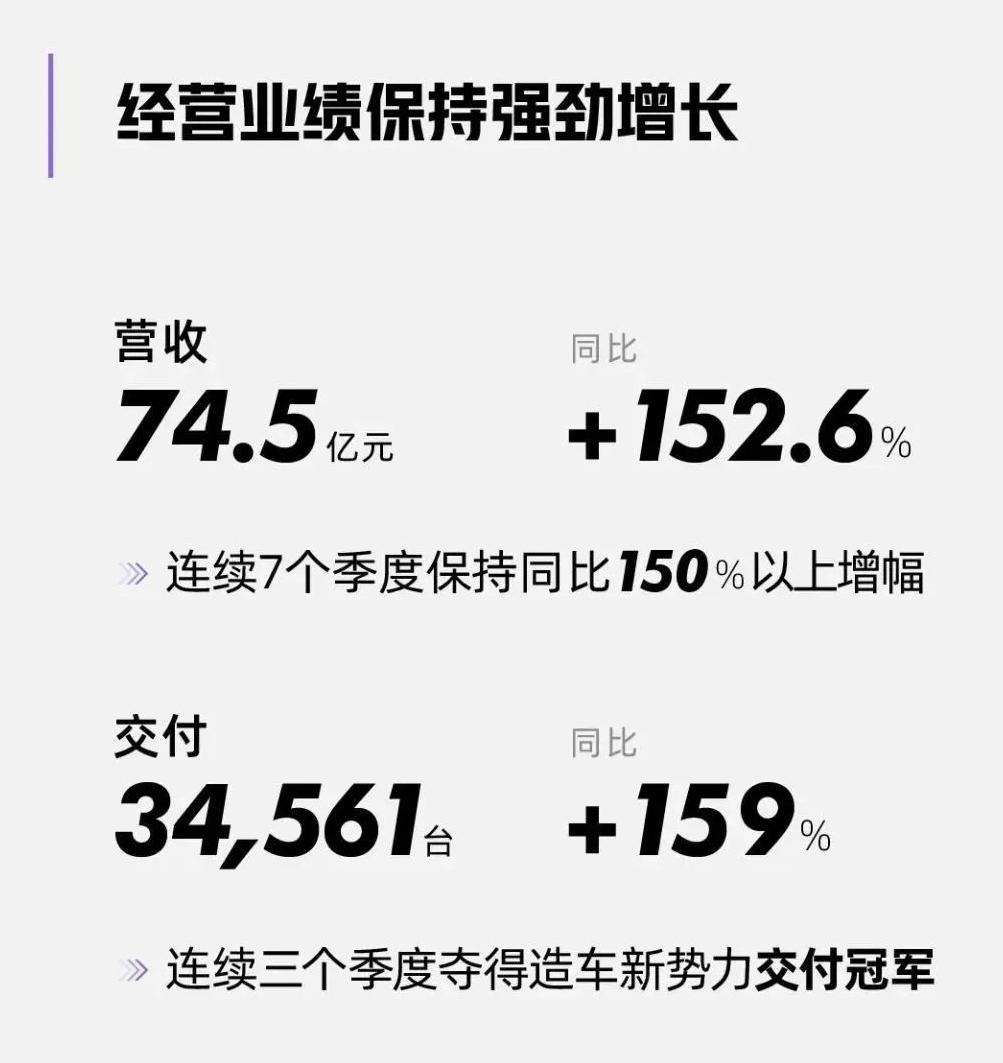 不过小鹏还是交出了一份比较令人满意的答卷,Q1小鹏汽车营收 74.55 亿元,同比增长 152.6%,高于市场预期。其中汽车销售收入接近 70 亿元,占总营收的 94%。连续 7 个季度营收保持同比150%以上增幅、连续3个季度交付量蝉联新势力交付榜首。
