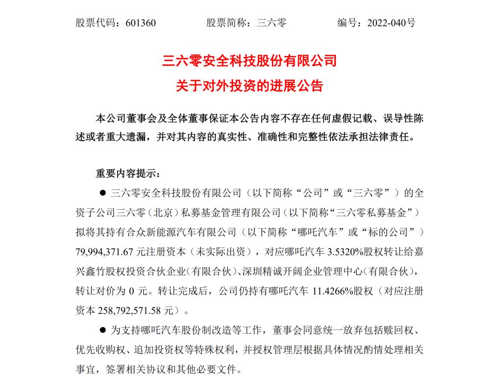 日前,360发布一则公告称,旗下全资子公司三六零基金拟将其持有哪吒汽车7999.4万元注册资本(未实际出资),对应3.5320%股权转让给嘉兴鑫竹股权投资合伙企业(有限合伙)、深圳精诚开阔企业管理中心(有限合伙),转让对价为0元。
