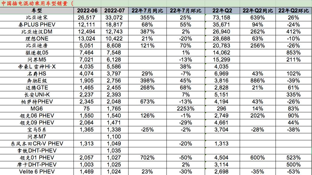 图:2022年6-7月中国插混乘用车销量情况,来源:网络