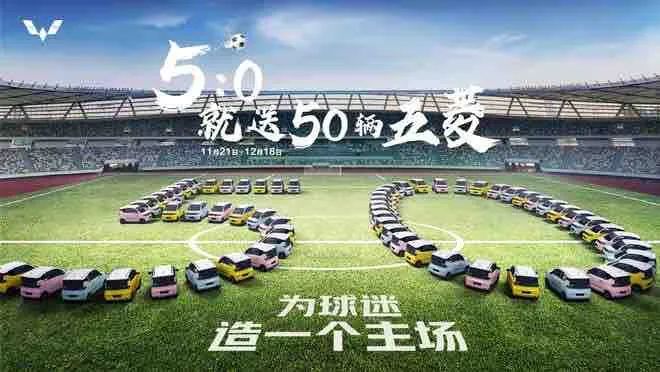 除此之外,也有中国品牌以自己的方式来搭上世界杯的热度,上汽通用五菱就举办了一场特殊的活动。据五菱官方表示,世界杯期间任意一场比赛最终成绩为5:0,就送出50辆五菱宏光MINIEV,届时官方将通过直播的方式进行摇号抽奖。