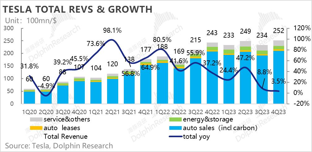 2023年四季度特斯拉营收252亿美元,明显低于彭博上的卖方一致预期256亿美金。