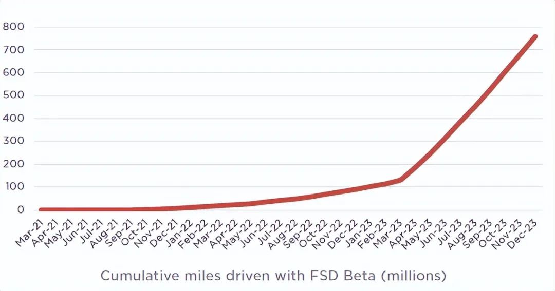 2022年底,FSD上一次大迭代带来累积里程出现了一次非线性的上扬之后,再次进入线性累计上行阶段。其中重点关注FSD最新版本V12批量的落地速度,以及用户渗透率情况。