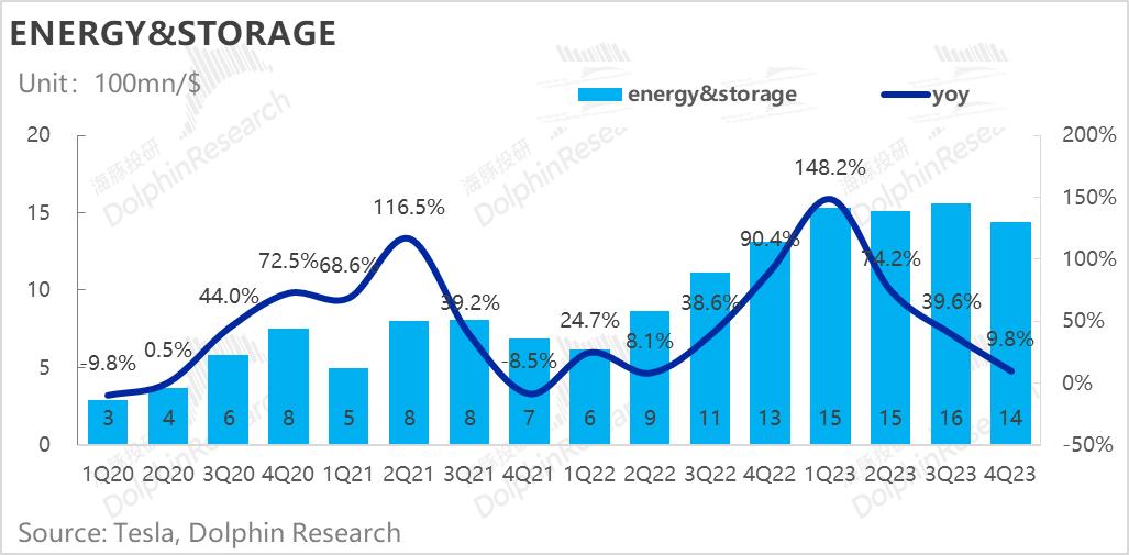 今年四季度实现营收14亿美元,增速已经快速回落到10%,明显低于市场预期的17.7亿。之前储能装机因季节性因素有所放缓,同比已回落到30%,环比首次停滞;而光伏安装因利率较高压制需求,环比下行,同比不至砍半,