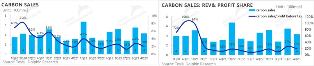 海豚君注意到目前市场对特斯拉2024年汽车毛利率预期(含积分)基本看齐2023年的二季度在19%以上,在全球新能车补贴逐步退出、特斯拉很难涨价,Cybertruck拖累毛利率的情况下,海豚君认为当前市场对于2024年的毛利率预期也有下调的风险。