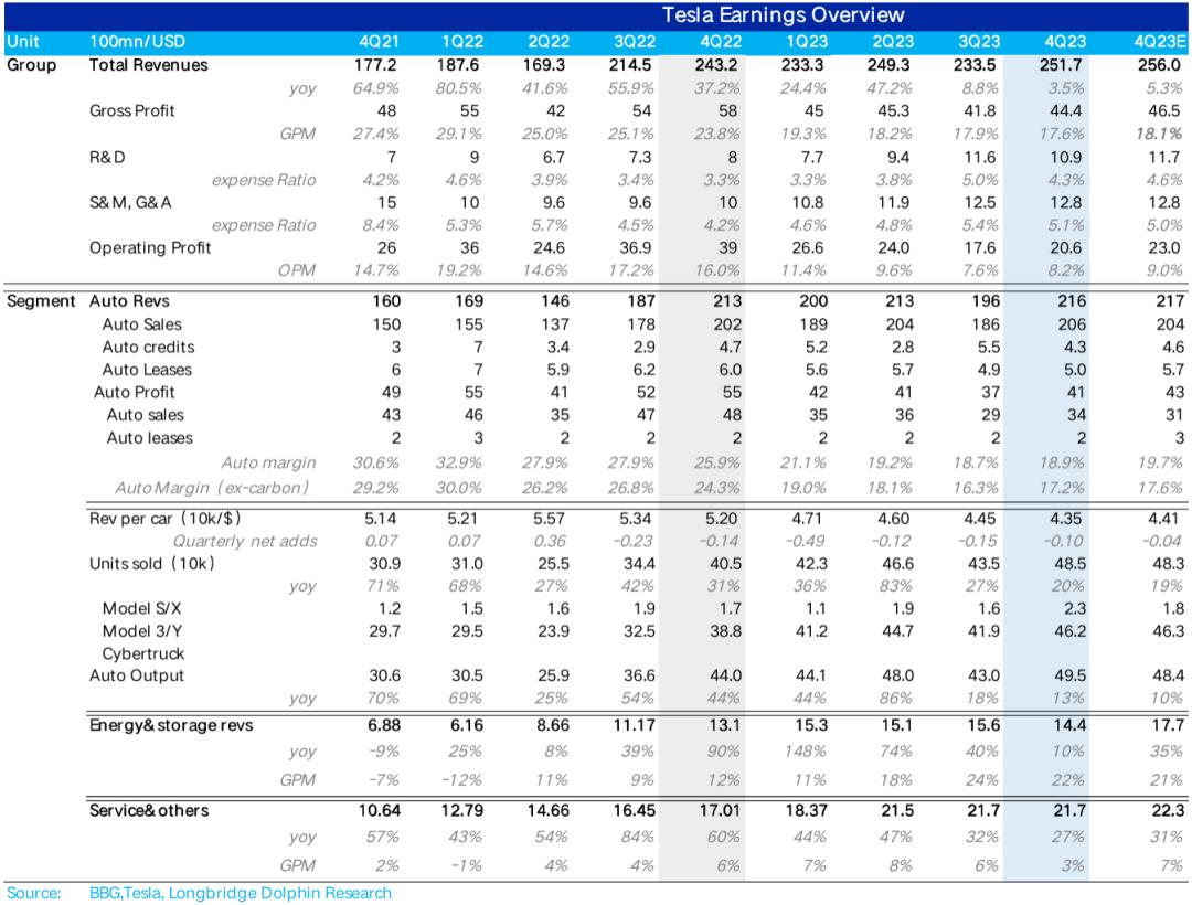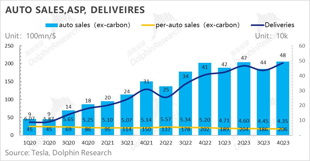 虽然四季度特斯拉最终销量还不错,保住了去年180万的销量目标,但以北美为主的连续降价导致它单价再次下滑,幅度明显超出了市场预期,最终汽车收入只能说相对平平。