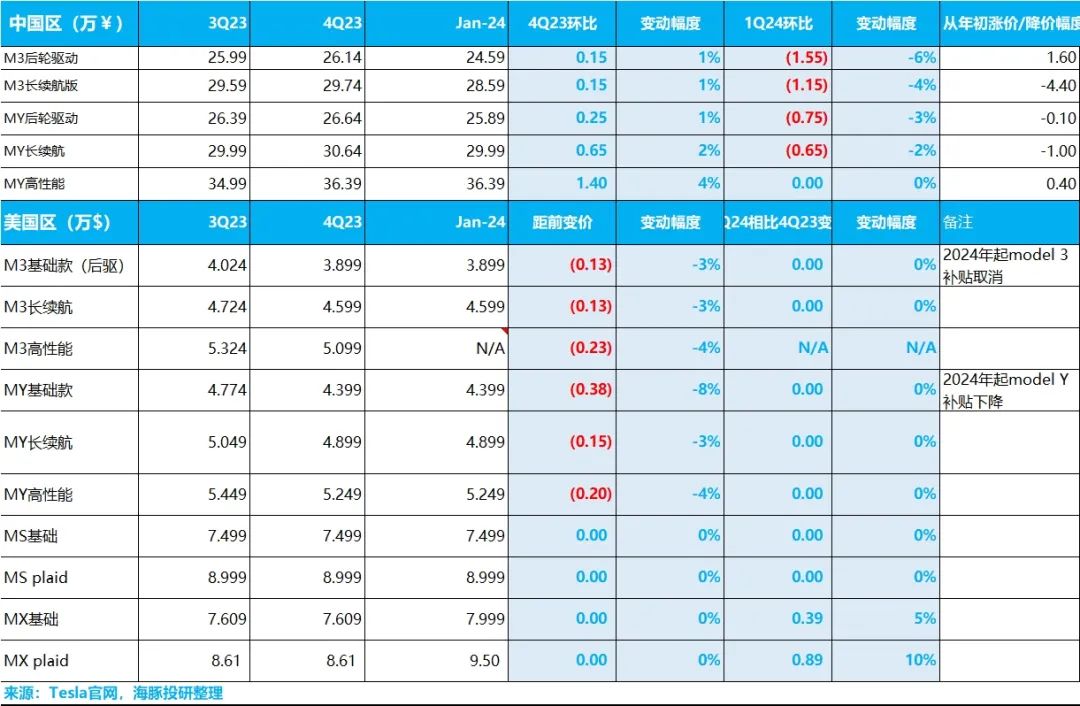 2)美国区开年从2024年1月1日开始,Model 3因为用了中国的磷酸铁锂电池, IRA补贴全部取消;Model Y的IRA补贴也有可能从7500降至3750美元;