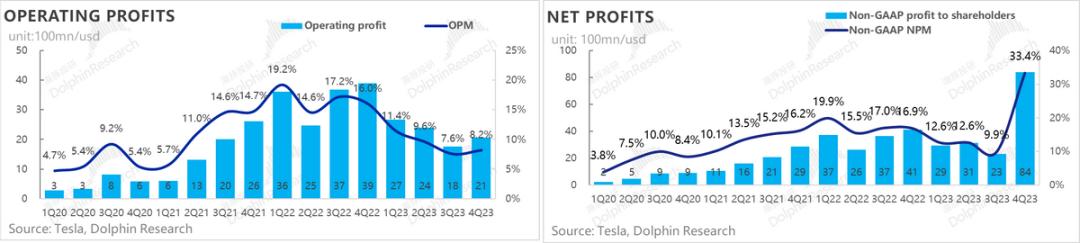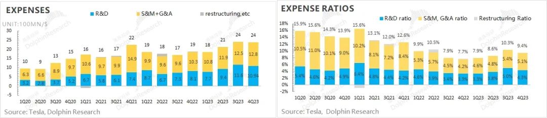 对于DOJO、AI机器人等的投入,特斯拉之前已经上调过资本开支。从四季度的情况来看,三季度资本开支、研发费用都在高位上稳定下来,没有进一步爬升。