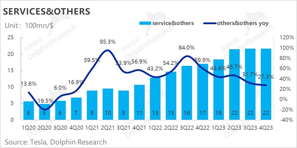 4.2.四季度特斯拉实现服务业务营收22亿美元,同比继续回落到27%。充电桩、保险等车后服务想象力业务,当前业绩都在这里体现。只是目前来看这块业务的收入第一大贡献还是靠卖汽车零部件与二手车。其中二手车因为新能车竞争压力变大,同时现在全球汽车的产能供给都在恢复,二手车的空间已经变小。