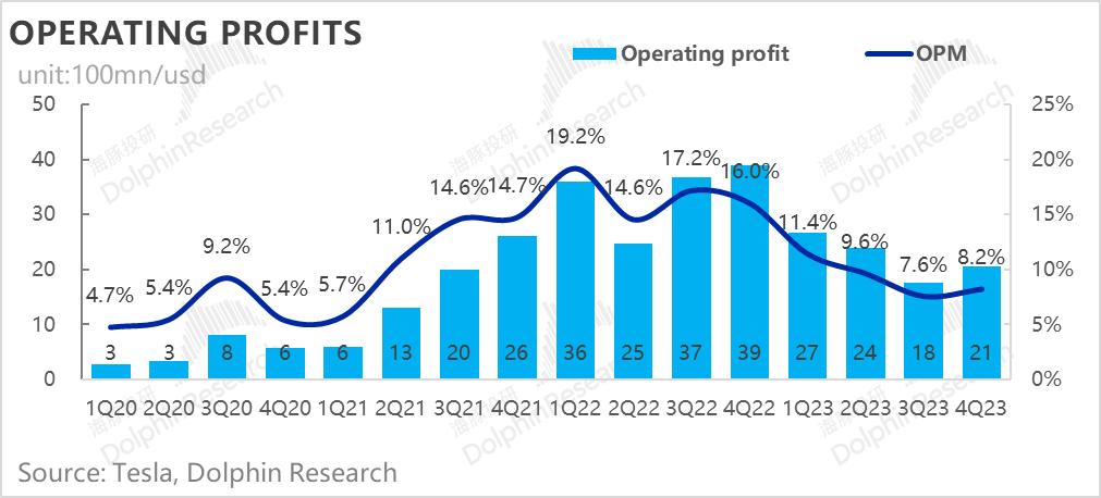 即使四季度特斯拉工厂的效率之王上海工厂走出关停,且换新的Model 3爬坡顺利(两个月就完全上量),单车毛利继续失守,导致最终经营利润只有21亿美元,相比去年同期接近砍半,同样也低于市场预期的23亿;经营利润率也只有8.2%,再次低于市场预期。