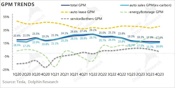 3)汽车毛利率再下台阶:最终单车毛利7200,汽车销售(剔租赁与积分)毛利率16.6%,仍然在15-17%之间徘徊,并没有恢复到17%以上。这样下来,特斯拉裸卖车业务的毛利率画风已经长成了这样: