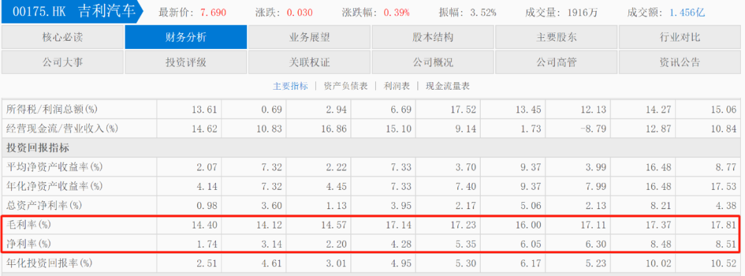 而14.40%的毛利率是继2022年14.12%之后的毛利率的新低,近三个报告期的毛利率均低于15%,创下新纪录,此前,吉利汽车毛利率动辄17%以上,毛利率下滑较为明显。净利率方面,吉利汽车同样创下最低纪录。1.74%的净利率是吉利汽车首次低于2%。此前同期基本维持在4%至8.5%之间,如今的净利率不足高峰时的1/6。