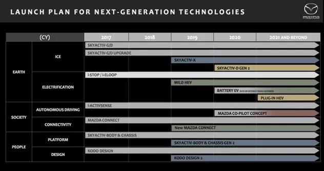 从马自达公布的“电动化计划”来看,除Skyactiv-X等引擎内燃机技术外,未来48V Mild Hybrid轻混动系统、Battery EV纯电动车以及Plug-in Hybrid插电式混合动力等将成为主要的电动化进程。