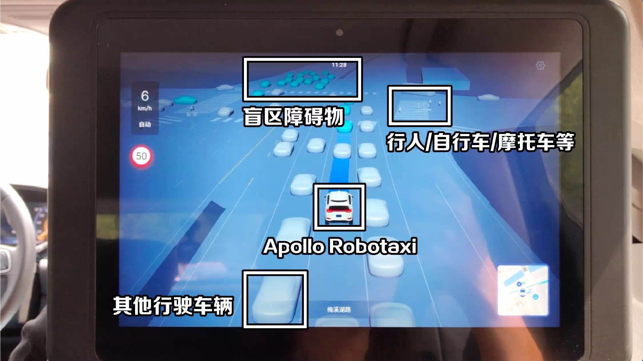 从百度公布的驾驶视频来看,在行驶过程中,自动驾驶出租车可以根据路况进行智能变道,并判断周边车辆的行驶状况,对近距离超车等情况做出自动避让。此外,百度 Robotaxi 还配备了车路协同系统,车内屏幕上会实时显示当前路面上的行人、汽车等信息,还能显示出车内司机视角所看不到的盲区,提前预告红绿灯变化及等待时间。