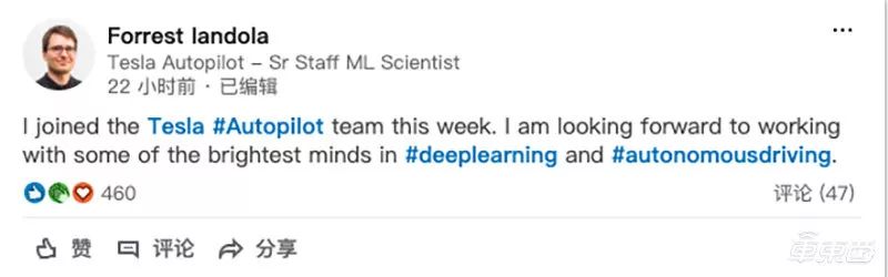 目前,DeepScale的首席执行官Forrest Iandola在领英上发布公告声明他已经在本周加入了特斯拉,在特斯拉机器学习部门任职。他在领英上写道:“我已经在本周加入了特斯拉自动驾驶团队,我很期待与深度学习和自动驾驶部门的人一起工作。”