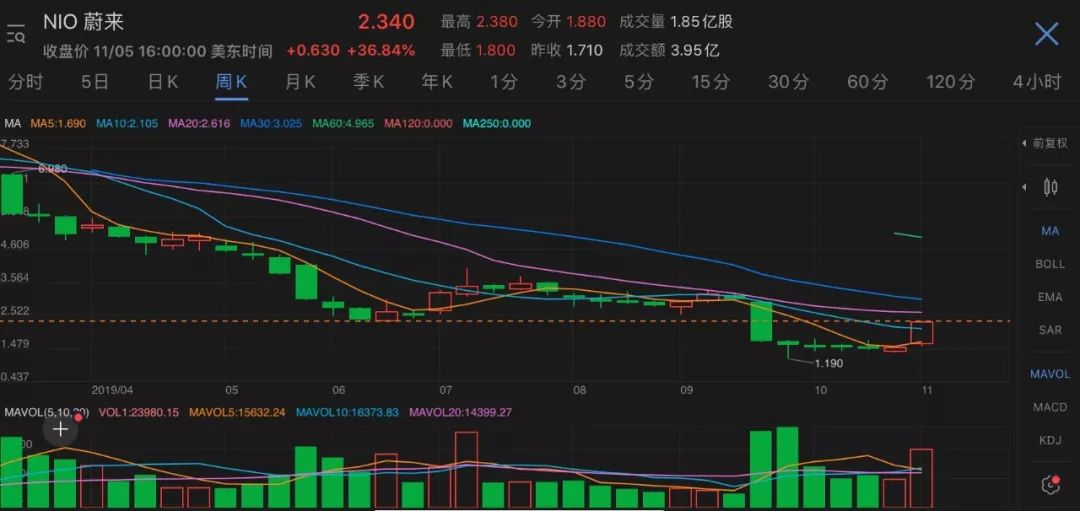 截至美国时间11月5日美股收盘,蔚来汽车股价飙涨36.84%,报2.34美元,5日累积涨幅超60%。这意味着,以1.19美元的价格抄底蔚来的股民,收益几近翻番。