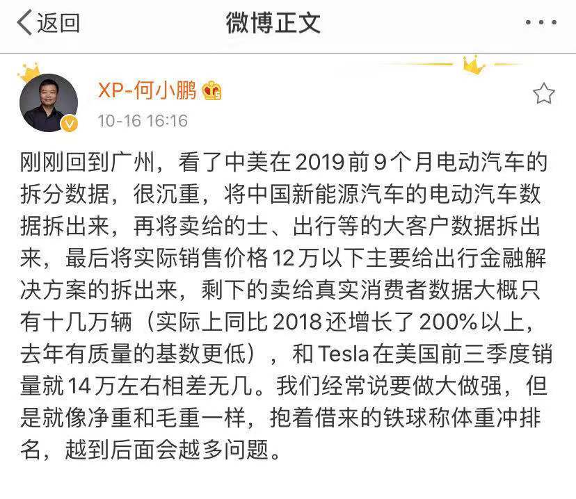 对于业内在新能源销量上的“数字游戏”,何小鹏感慨道:“我们经常说要做大做强,但是就像净重和毛重一样,抱着借来的铁球称体重冲排名,越到后面会越多问题。“