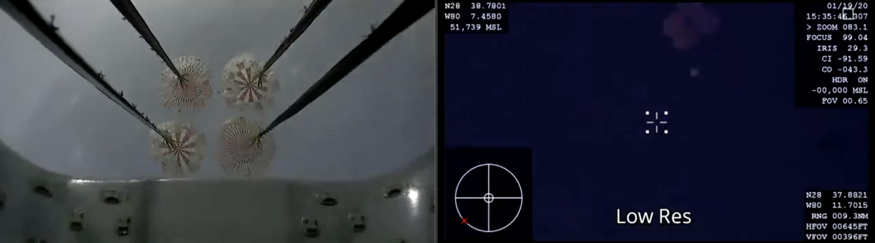 载人飞船打开降落伞的画面 来源:Twitter视频截图