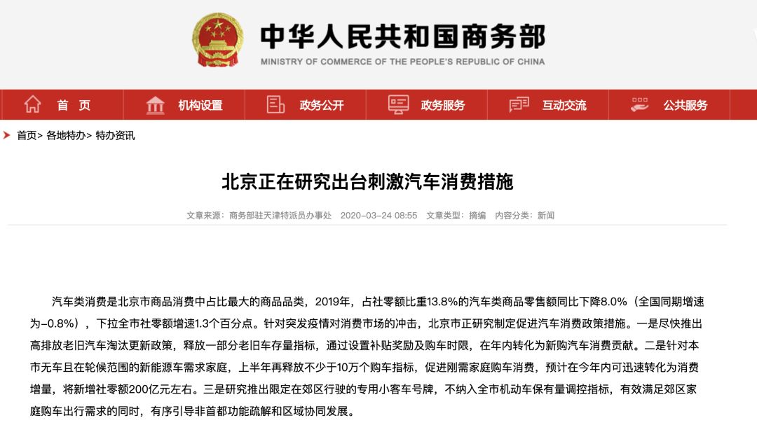 3月24日下午,商务部网站公布了一则《北京正在研究出台刺激汽车消费措施》的信息,其中提出,针对本市无车且在轮候范围的新能源车需求家庭,上半年再释放不少于10万个购车指标,促进刚需家庭购车消费。