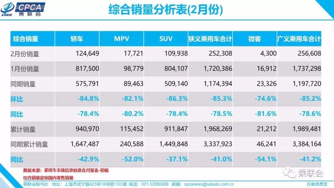 轿车、SUV、MPV销量同比下滑都在78%以上;新能源车方面,2月共销售1.0万台,同比下降63.8%。