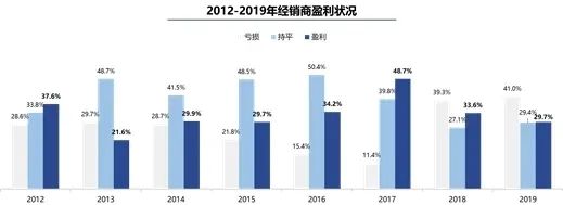 中国汽车流通协会近期发布的《2019年全国汽车经销商生存状况调查报告》中显示,2019年完成全年销售目标的经销商占比仅为28.9%,另有7.4%的经销商目标完成率在50%以下。盈利方面,相比2018年,2019年经销商的亏损面扩大至41.0%,亏损比例大幅增加,盈利经销商比例减少至29.7%。