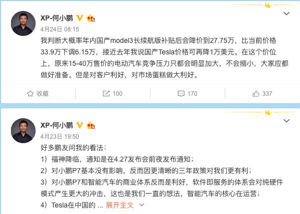 在此前特斯拉中国工厂下线时,小鹏汽车创始人何小鹏也曾发微博公开表示,特斯拉在中国的毛利有30%,完全有能力适应新的政策和市场变化,这对部分合资和高端品牌的新EV产生更大的挑战。何小鹏预测,特斯拉年内国产Model 3长续航版补贴后大概率会降价到27.75万,比当前价格33.9万下调6.15万。“在这个价位上,原来15万-40万元售价的电动汽车竞争压力都会明显加大,大家应都做好准备。但是对客户利好,对市场蛋糕做大利好。”
