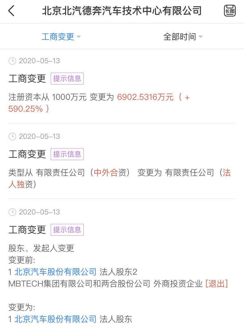 天眼查数据显示,5月中旬,北京北汽德奔汽车技术中心有限公司发生股权变更,MBtech Group(梅赛德斯-奔驰技术集团)退出北汽德奔,目前该公司由北京汽车股份有限公司100%全资控股,并在原来1000万元注册资金基础上增资至6902.5316万元。