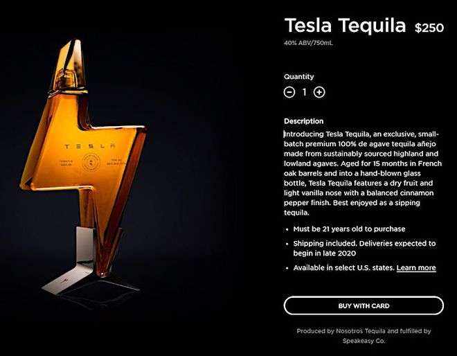 近日,特斯拉在其官方网站推出了同品牌龙舌兰酒(Tesla Tequila)。该款酒被特斯拉描述为“独家、小批量生产的高档酒,百分之百采用龙舌兰草酿造”,其装在一个闪电形状的玻璃酒瓶中。一瓶酒的容量为750毫升,酒精度40%,售价250美元,约合人民币1658元,比一瓶飞天茅台酒(官方指导价1499元)还要高。推出当日,这款酒就被抢购一空。空瓶现身二手物品交易网站ebay,并被卖到1420.69美元,约合人民币9418元。(未来汽车日报)